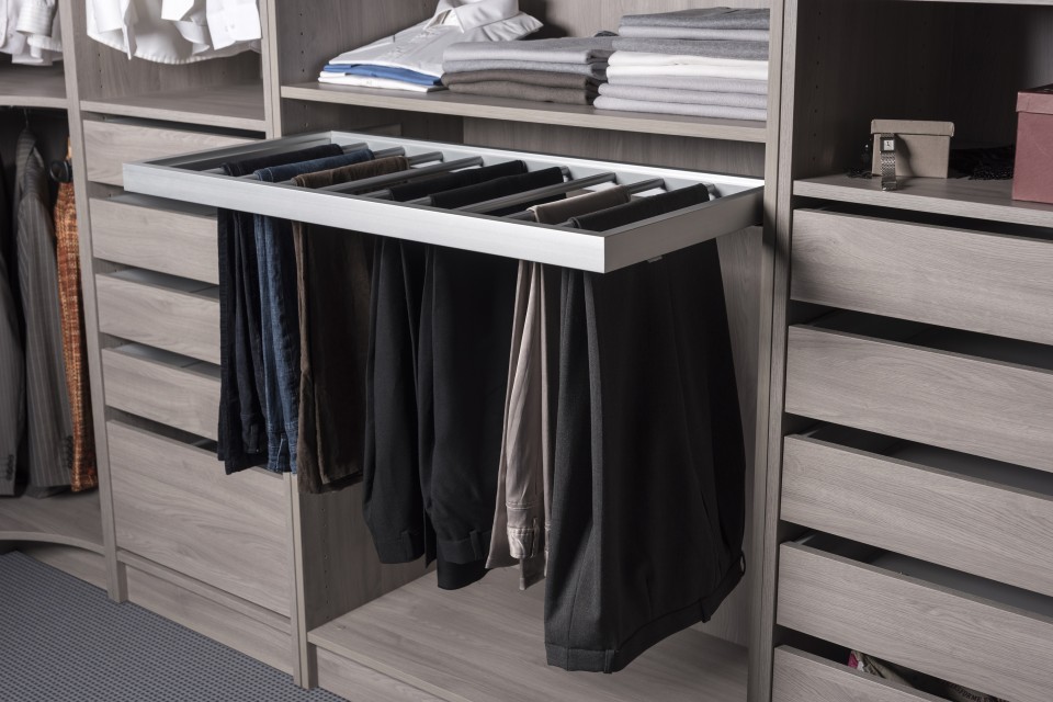 The pull-down hanger bar allows you to use the space at the top for jackets and shirts. |