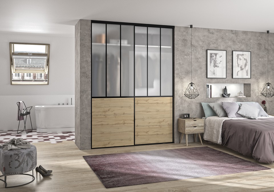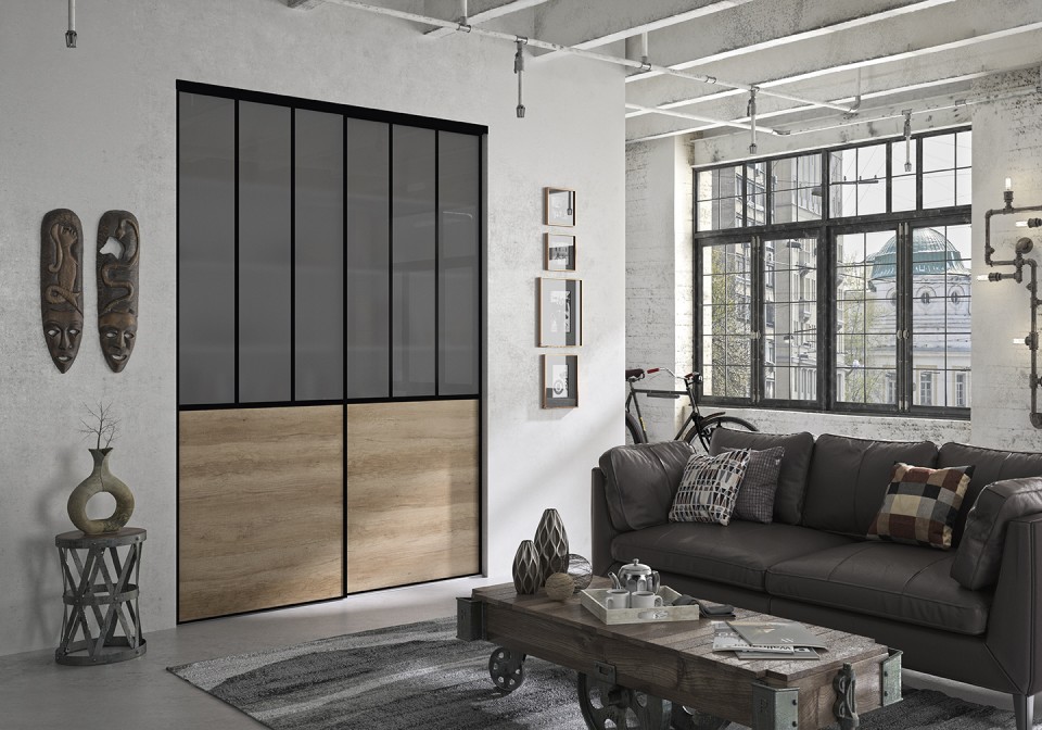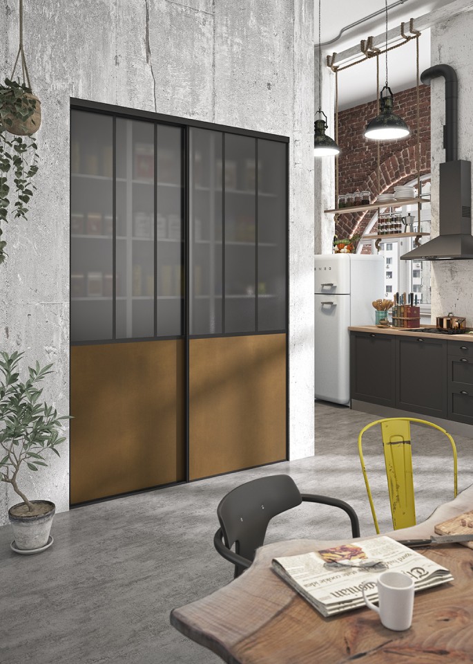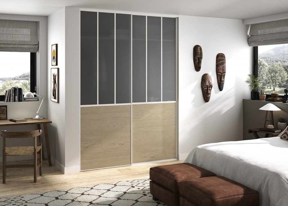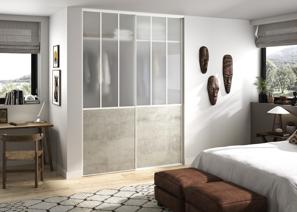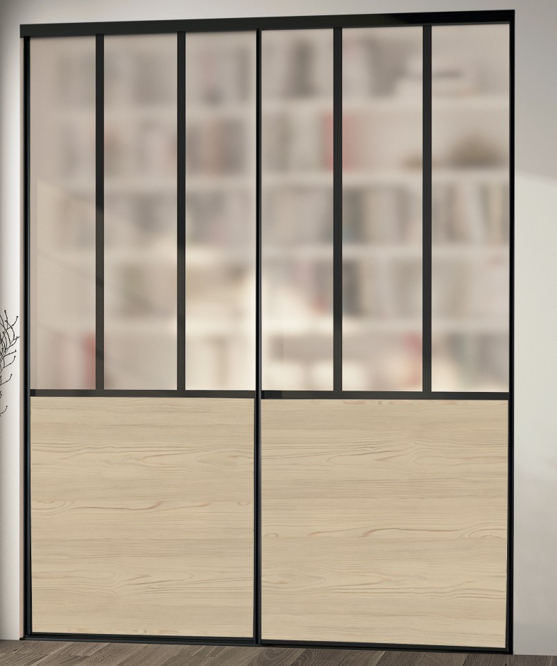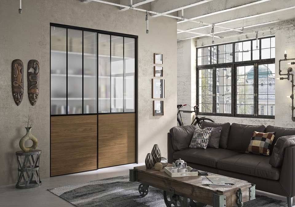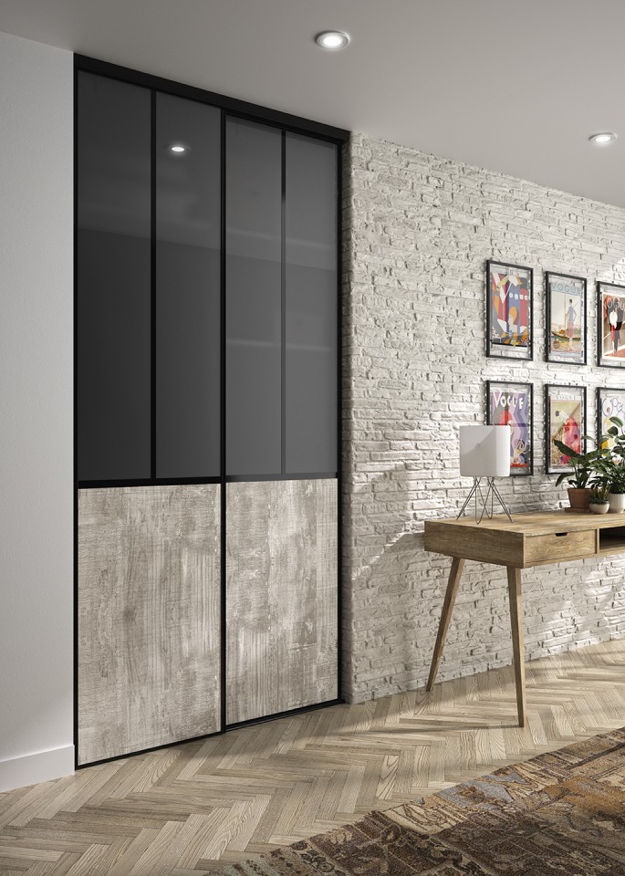 Enter a Workshop world where the closet door takes on a very special style. Bottom panel as it suits you and top part in glass, mirror or clear pane.