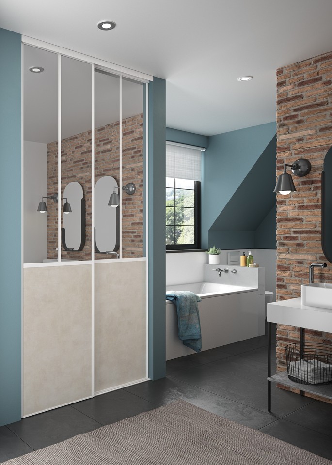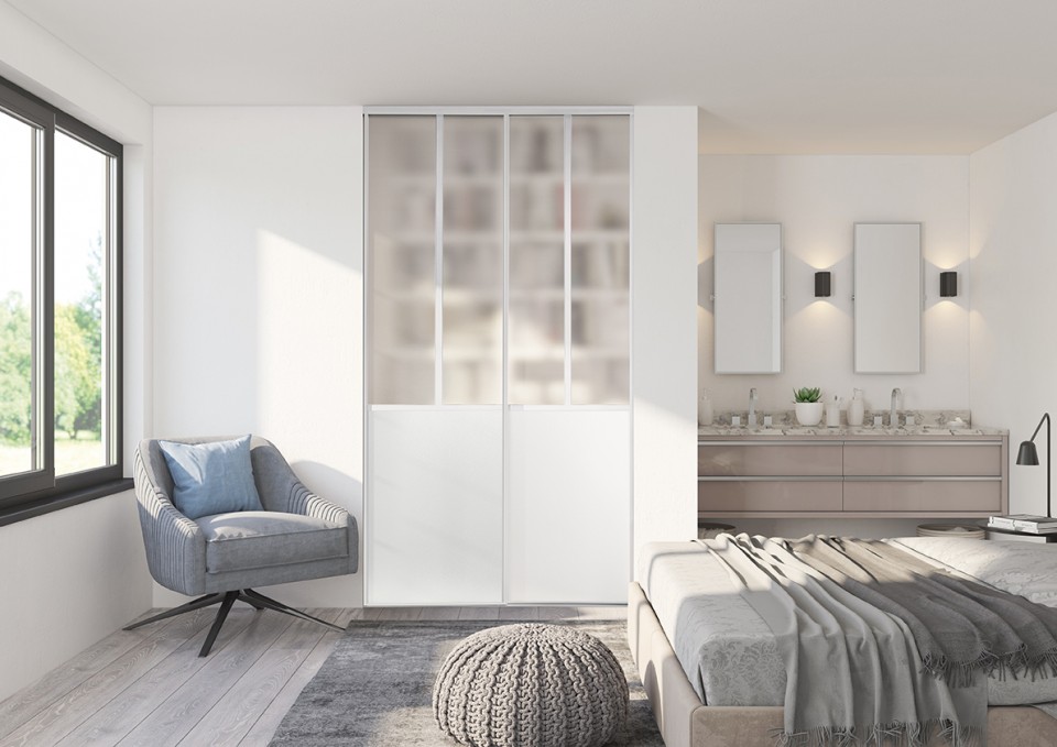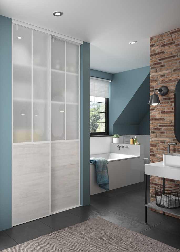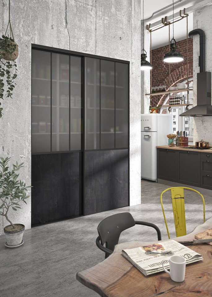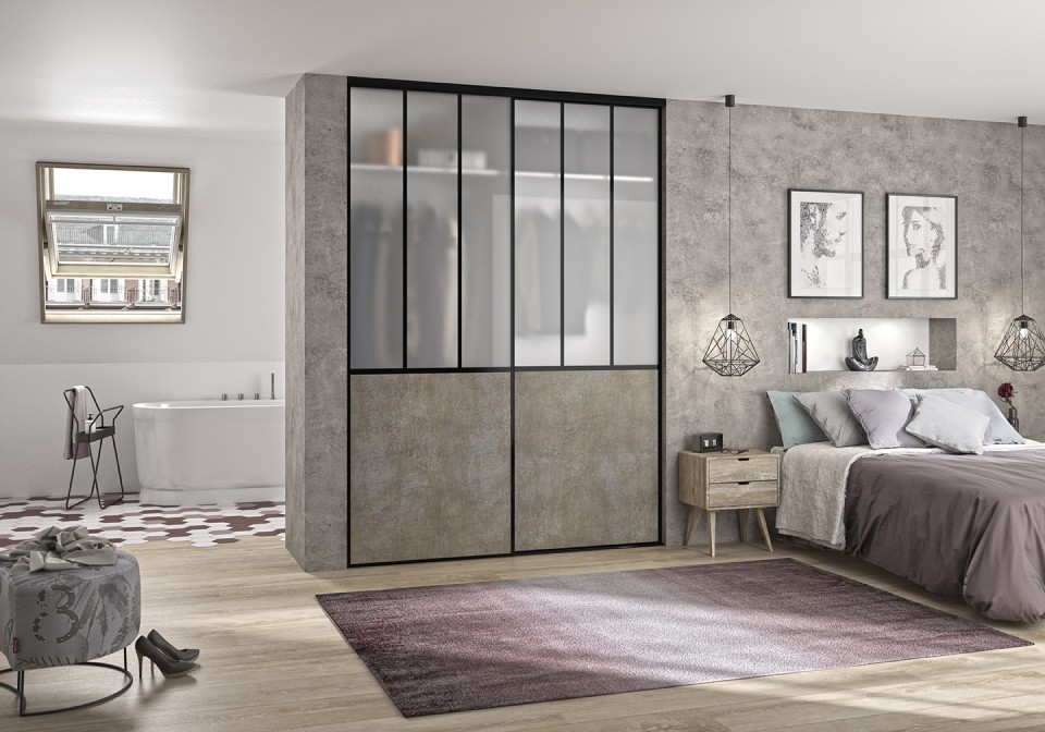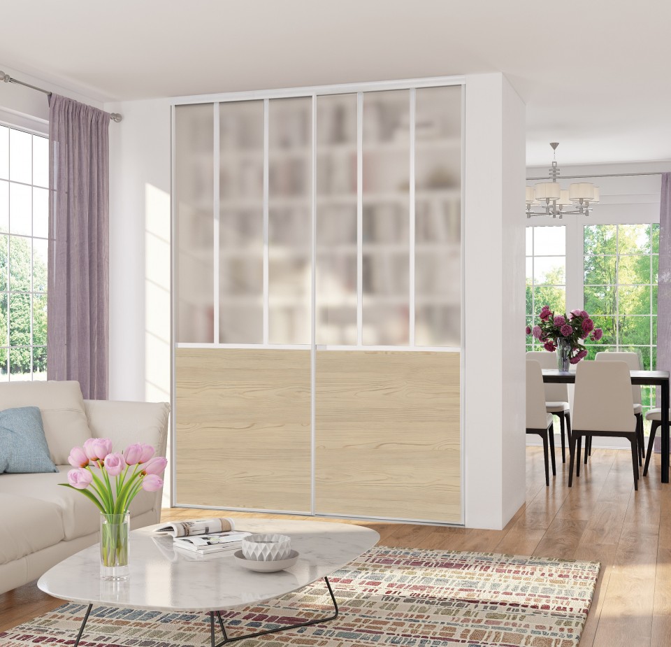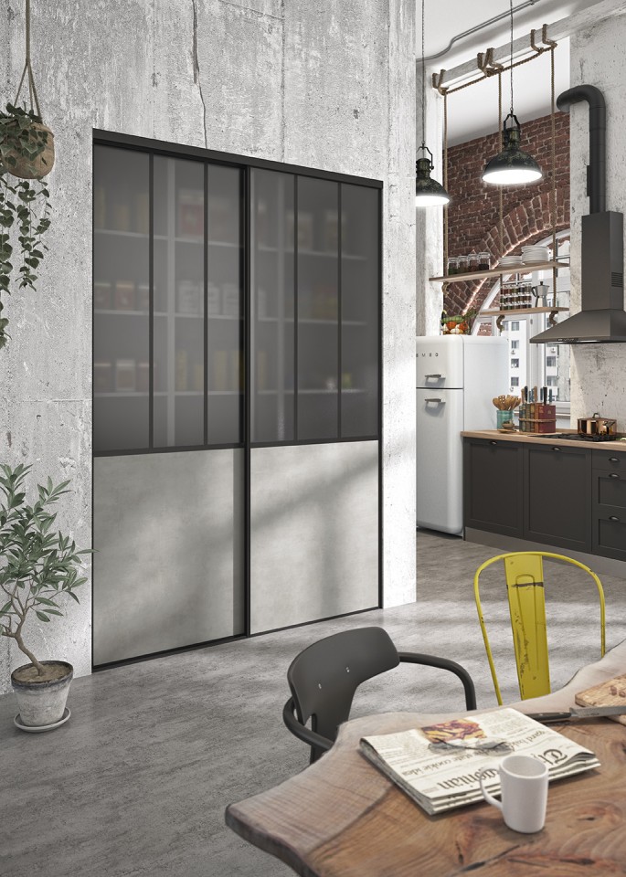 Enter a Workshop world where the closet door takes on a very special style. Bottom panel as it suits you and top part in glass, mirror or clear pane.