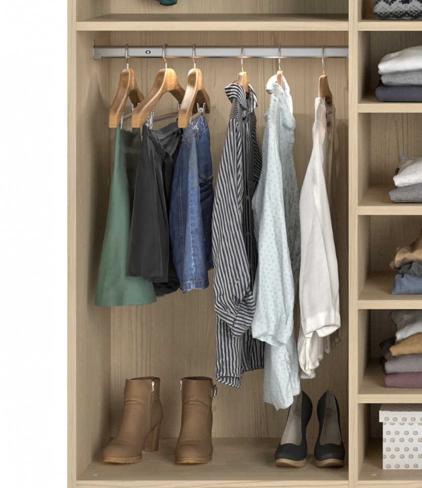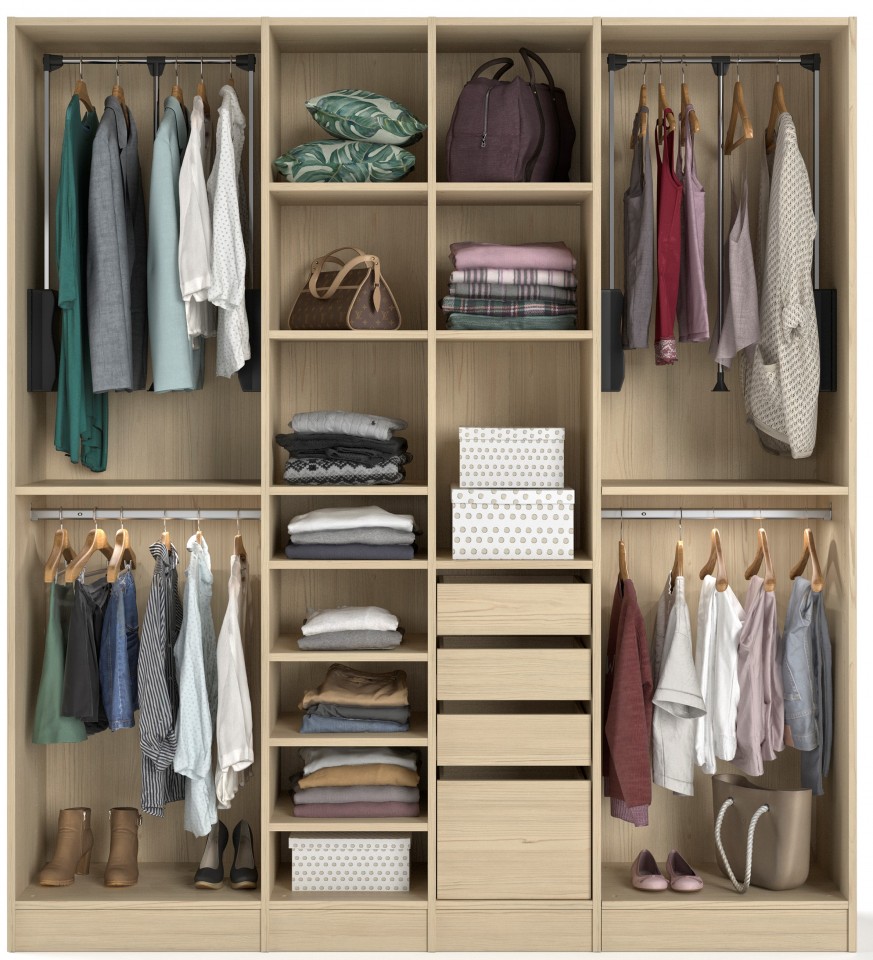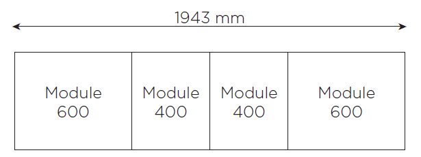 2 modules de 400 mm et 2 modules de 600 mm équipés de penderies, tiroirs et étagères pour un rangement maximum dans un espace minimum.