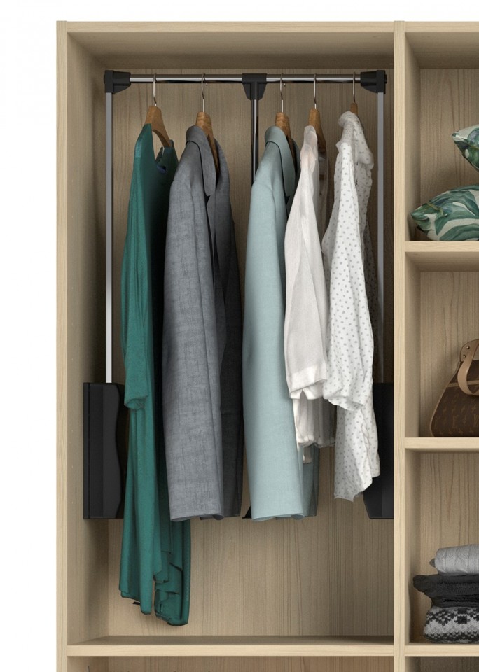 Les penderies sur 2 niveaux optimisent le rangement. L'utilisation de penderies basculantes permet une parfaite accessibilité aux vêtements suspendus en hauteur.