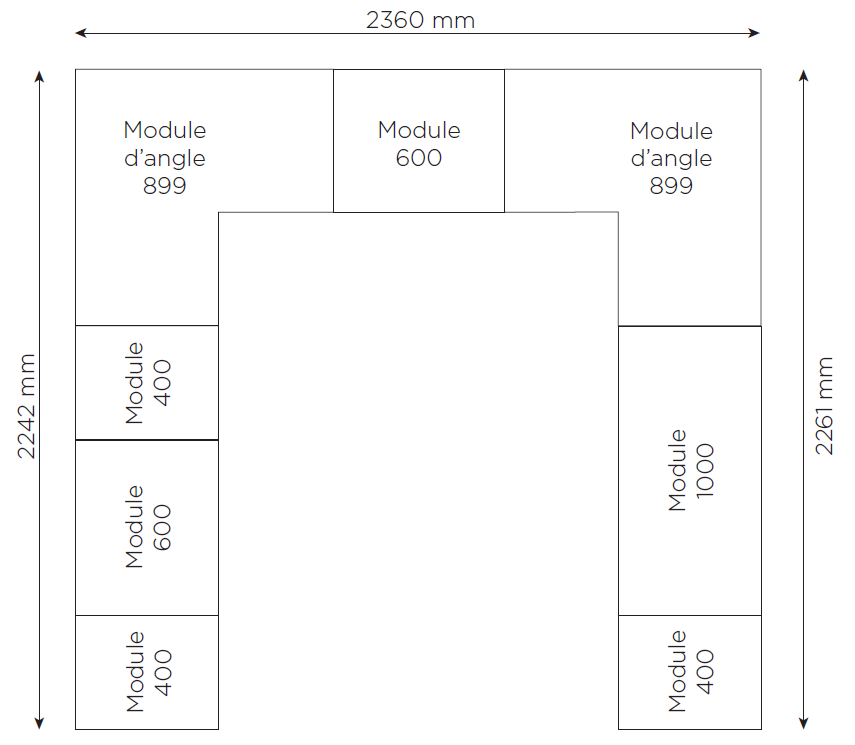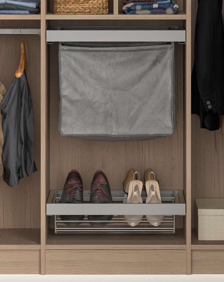 Un dressing en U qui permet d'exploiter les 3 côtés de la pièce sans perte de place. Des équipements bien adaptés pour que chaque objet trouve sa place et une utilisation de l'espace en hauteur pour la bagagerie.